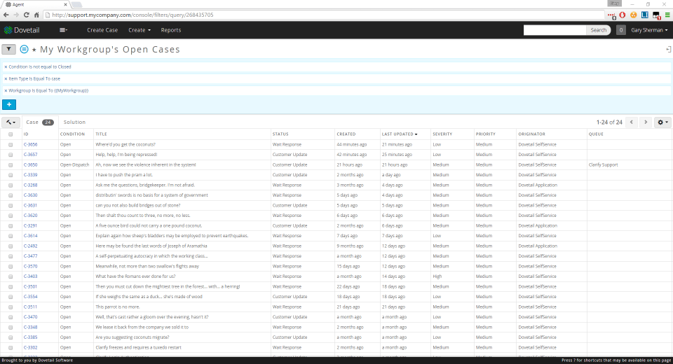Dovetail Agent provides deep case functionality but is designed to eliminate unnecessary clutter, reduce eye strain, and increase efficiency. The case history has been greatly enhanced to include inline images and richly formatted text, a user preference for ordering (chronological or reverse-chronological), and more details for each history item. In addition, the history updates automatically with any newly-added items while a user is viewing the page.