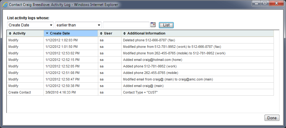 In addition, all of the additions/changes/deletes of these email and phone numbers are tracked in the activity log: