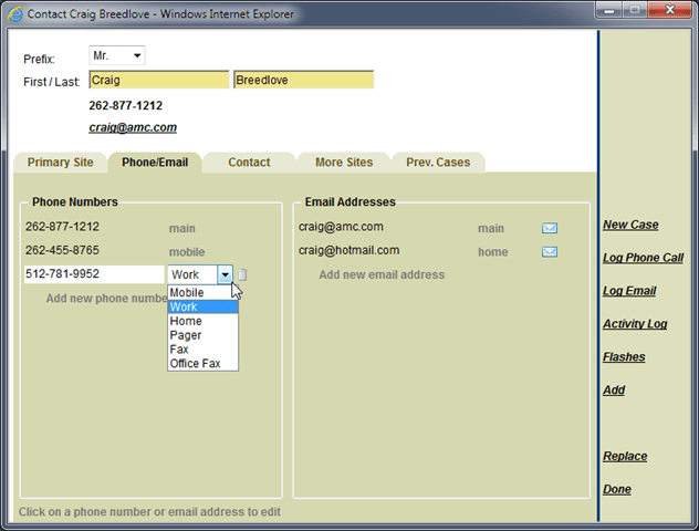 Contacts can now have unlimited phone numbers and email addresses. There is a new Phone/Email tab used to manage the phone numbers and email addresses for a contact.