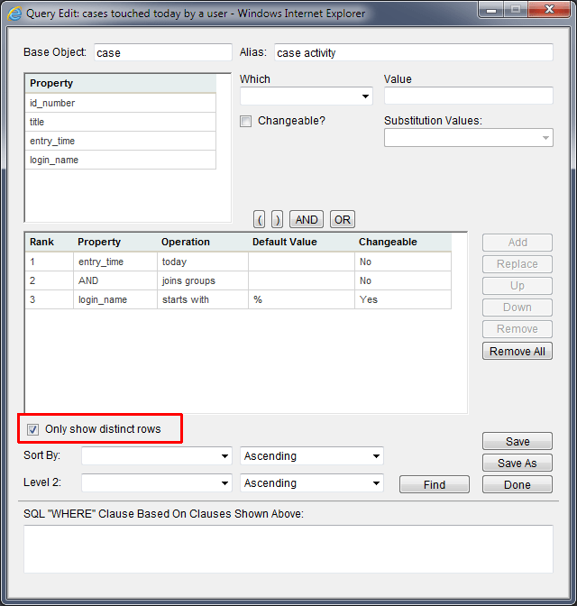 Without a distinct query, it’s possible that I would see the same case in the report multiple time. For example, if the same user logged multiple notes to the same case on the same day. Or if they did multiple workflow operations, which is also common.