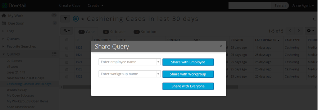- Share with an employee – type in an employee name, and the query will be shared with that employee.