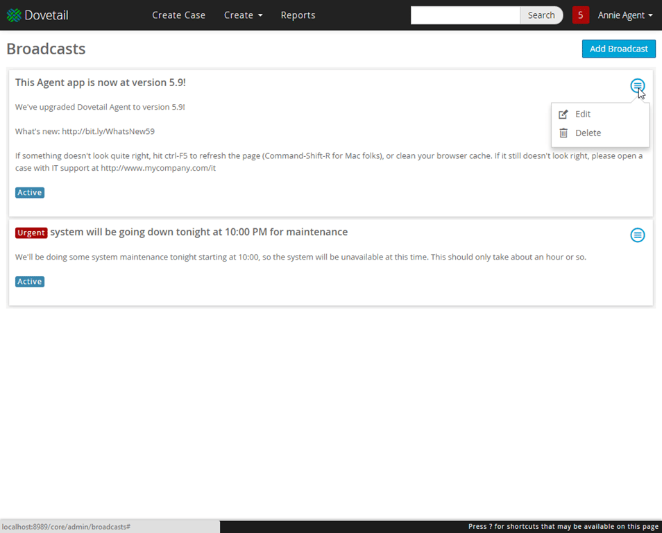 One of the newer features in Dovetail Agent is broadcasts. A broadcast is used to communicate a message to all users.