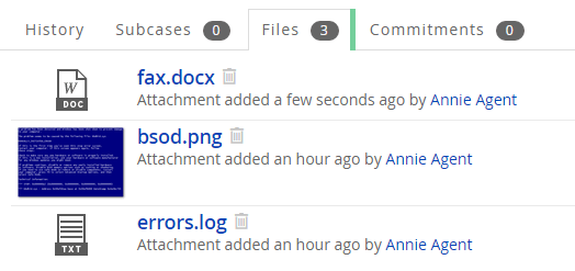 For files that are attached to a workflow item (such as case, subcase, and solution), the files are also shown in the History, and images are rendered inline.
