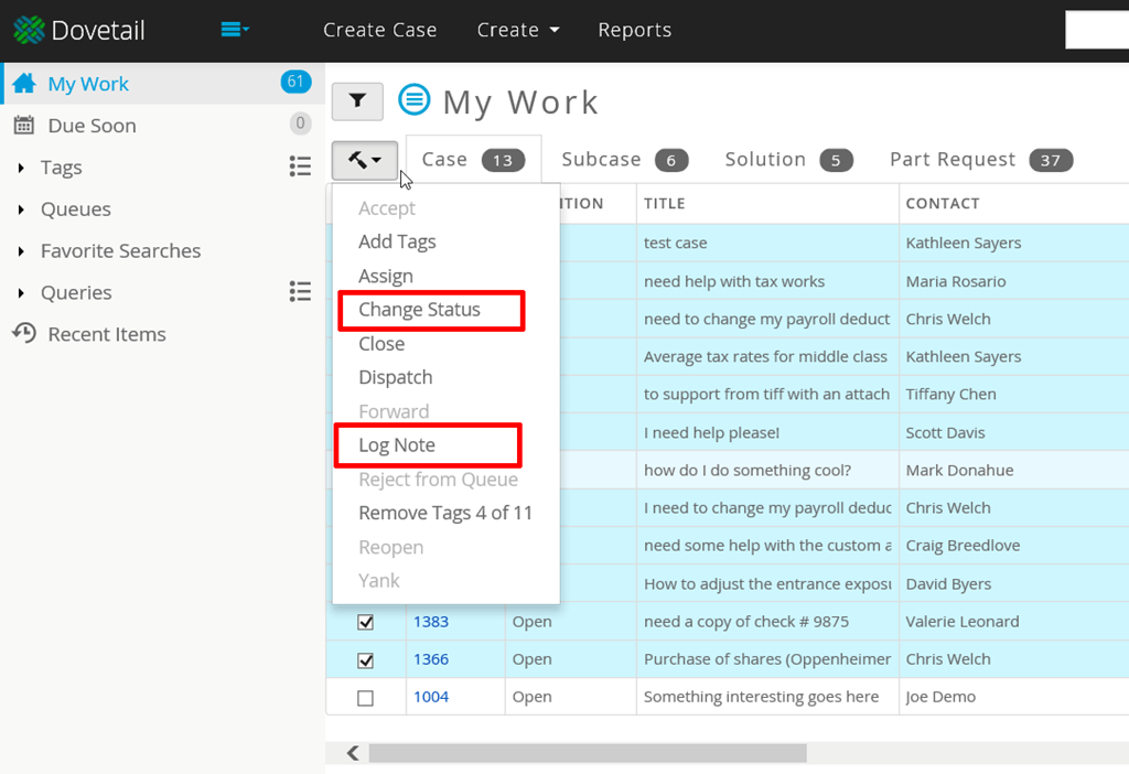 Change Status and Log Note are now available as batch actions, making it easy to log a note or change the status of many cases or subcases at one time.