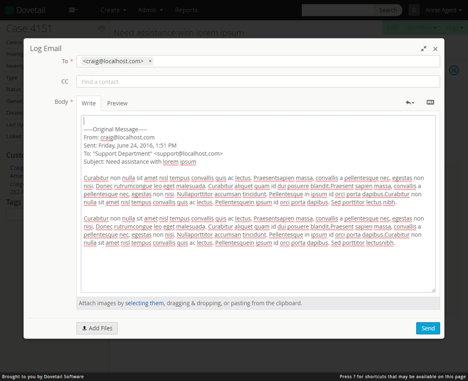 Once some canned responses have been created, from a Log Email or Log Note, users can select one, which will automatically insert that response into the text area.