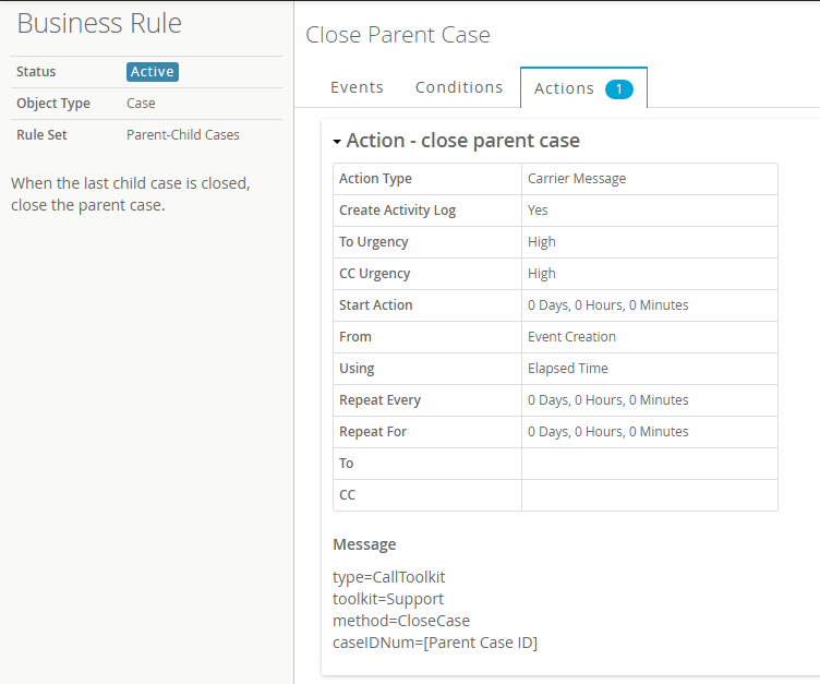 For the business rule action, notice that I’m sending Dovetail Carrier a CallToolkit message to invoke the CloseCase method within the Support toolkit.