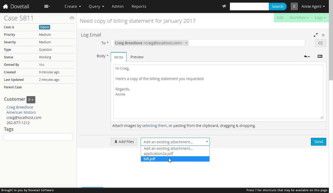 When logging an email, users can now select an existing file attachment to include in the outgoing email
